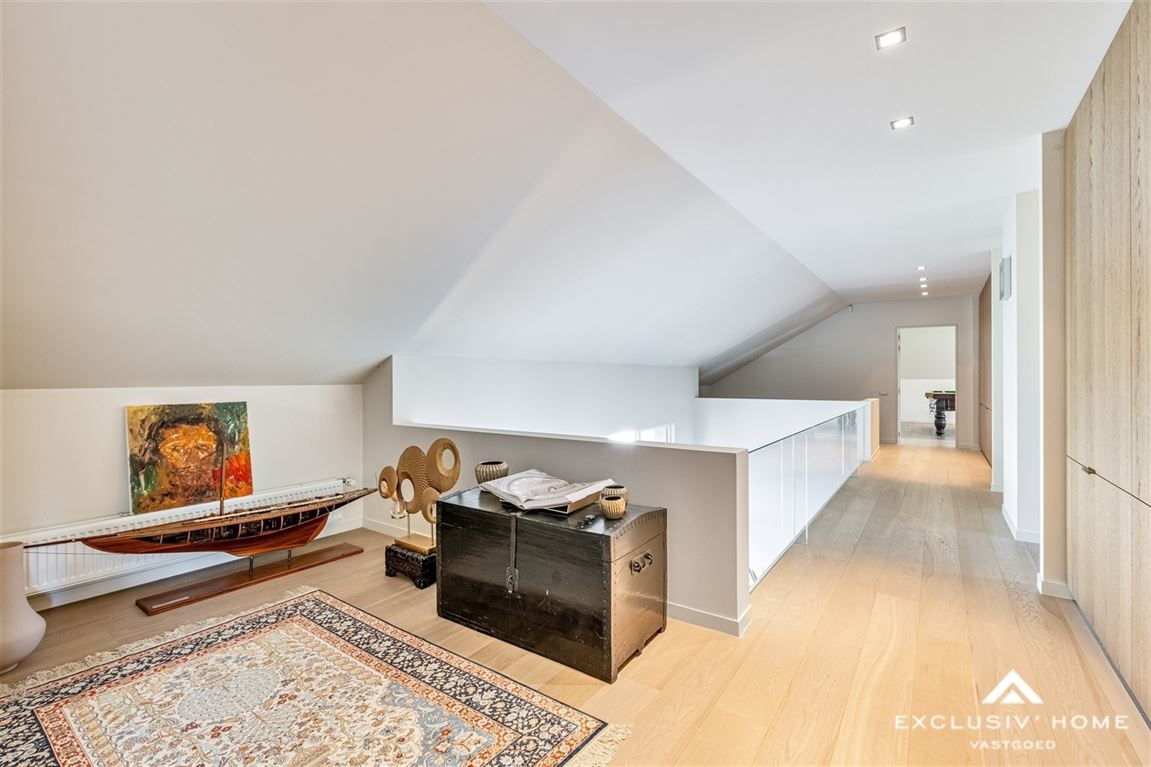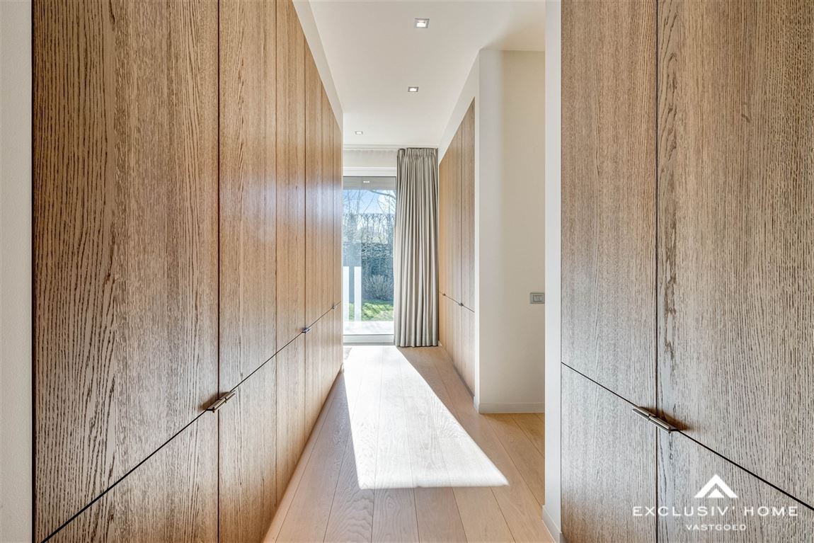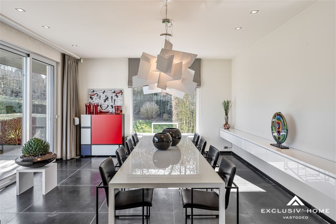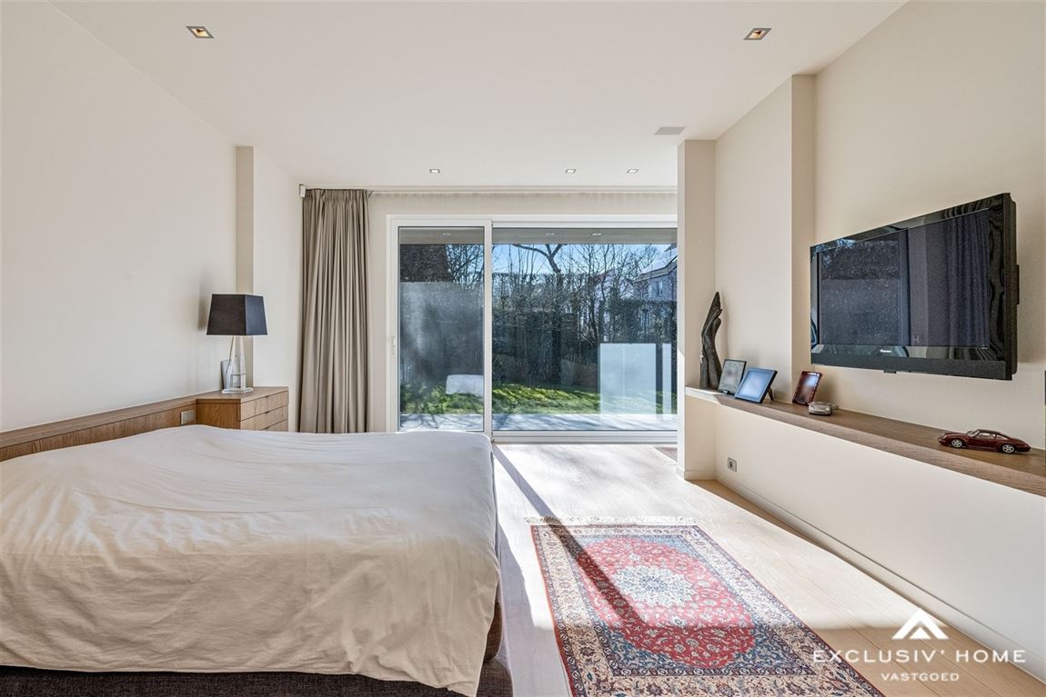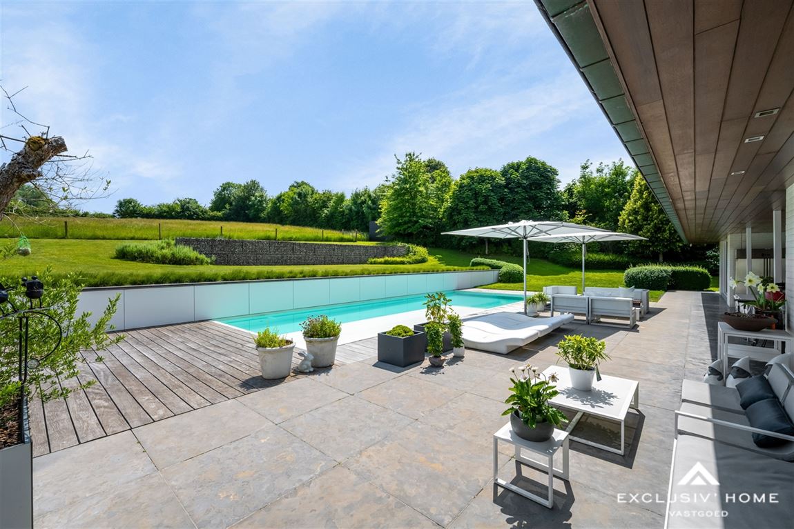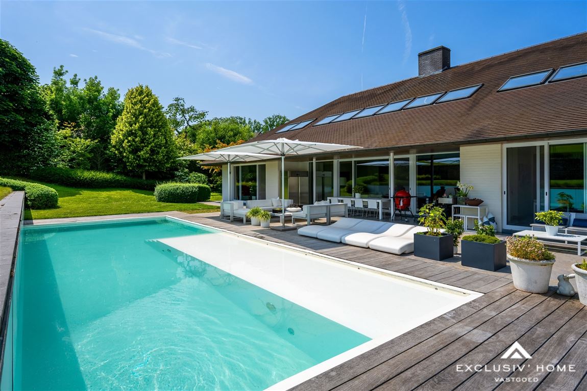 Bij binnenkomst in de villa komt men via de uitnodigende hal die toegang biedt tot een gastentoilet en vestiaire, een ruime en lichtrijke woonkamer met prachtig uitzicht op de tuin en het zwembad. Aangrenzend bevindt zich de eetkamer, de moderne, luxueuze keuken met hoogwaardige apparatuur, en een praktische bijkeuken. Ook op het gelijkvloers is de hoofdslaapkamer met ensuite badkamer, uitgerust met een inloopdouche, een ligbad en twee wastafels.