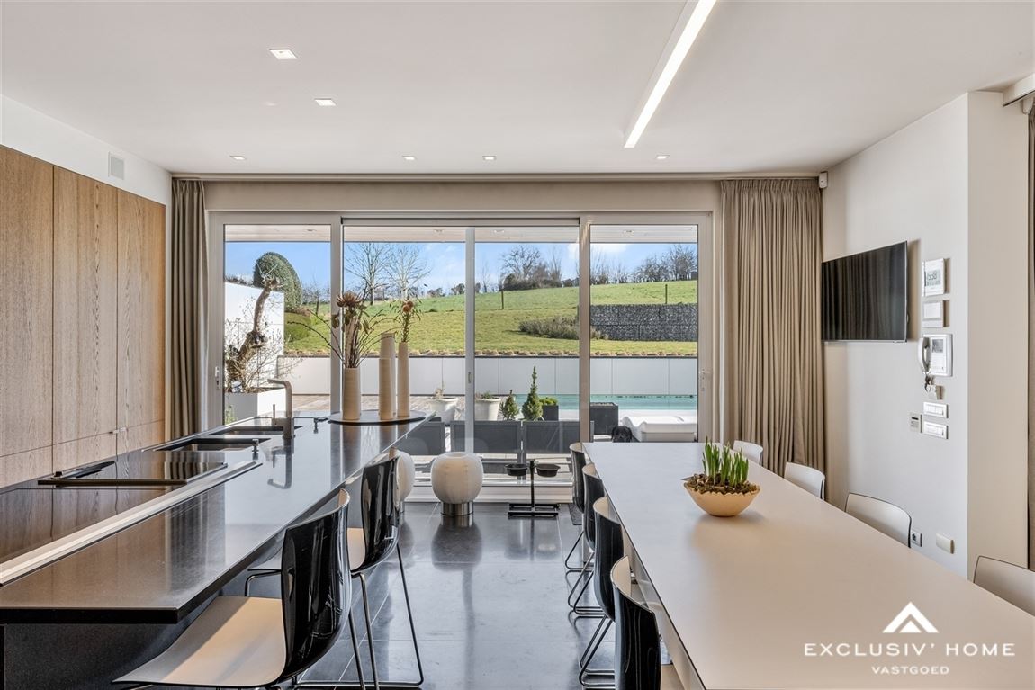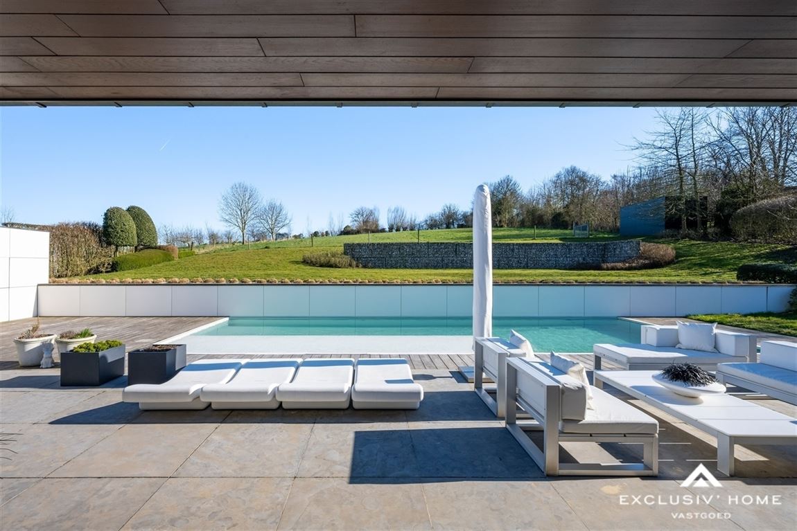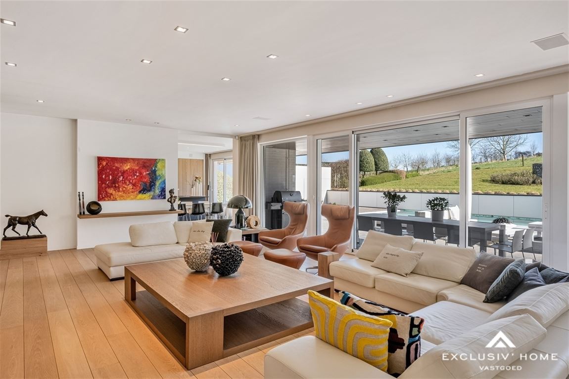 De woning valt op door haar minimalistische architectuur en biedt een uitzonderlijke ervaring dankzij de royale afmetingen, doordachte indeling en modern comfort. Alle leefruimtes bevinden zich aan de achterzijde van de villa, van waaruit men geniet van een adembenemend uitzicht over de tuin en het omliggende groene landschap.
